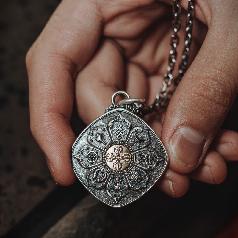 The sterling silver base blends vintage aging and fine polishing techniques, merging bronze tones with silver’s glow — as if holding the weight of time and sacredness close to your skin. When it rests against your skin, the Nine-Palace Eight-Trigram subtly realigns your aura, keeping distractions at bay; the blessings of the Eight Auspicious Symbols whisper all around, letting every corner of life glow with smooth fortune. More than just jewelry, it’s a “portable blessing talisman” crafted from Tantric wisdom. Guided by ancient symbols, it keeps your spirit steady and empowered as you embrace each day.